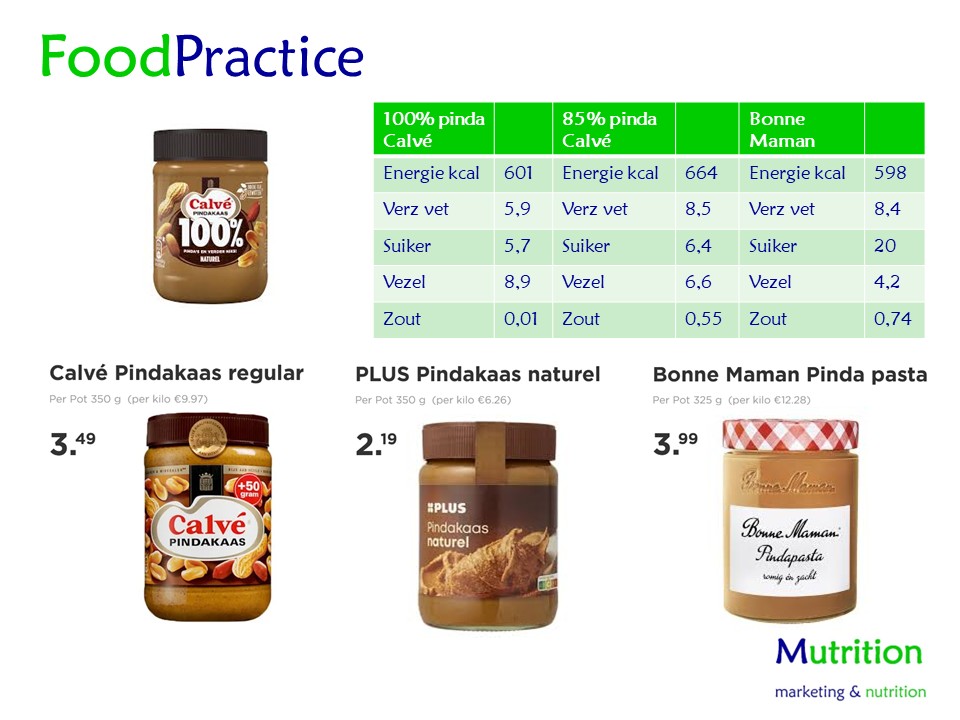 - Kies je voor 85% pinda → weet dat je inlevert op voedingswaarde maar wint in prijs